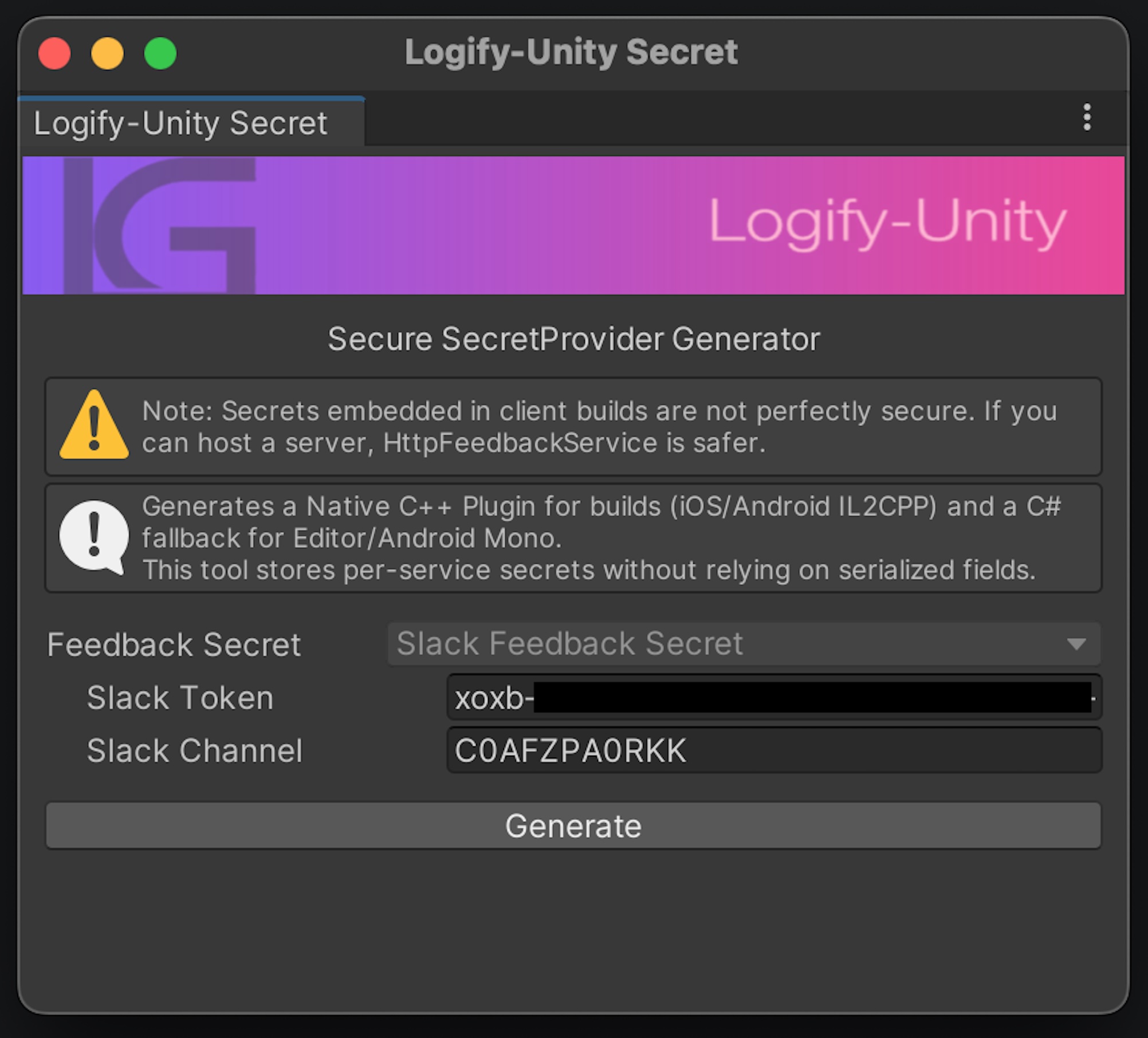 Integrate the obtained "token" and "channel ID" into Logify-Unity.