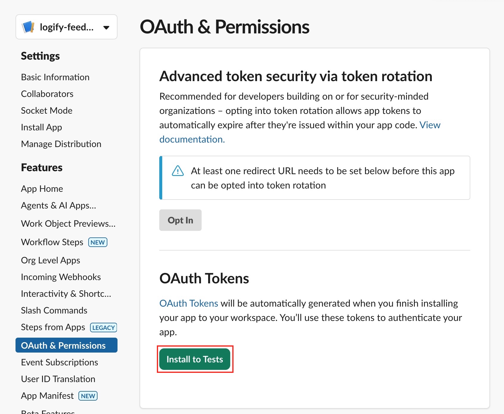 Install to Workspace Open OAuth & Permissions in the left menu and click Install to [Workspace Name].