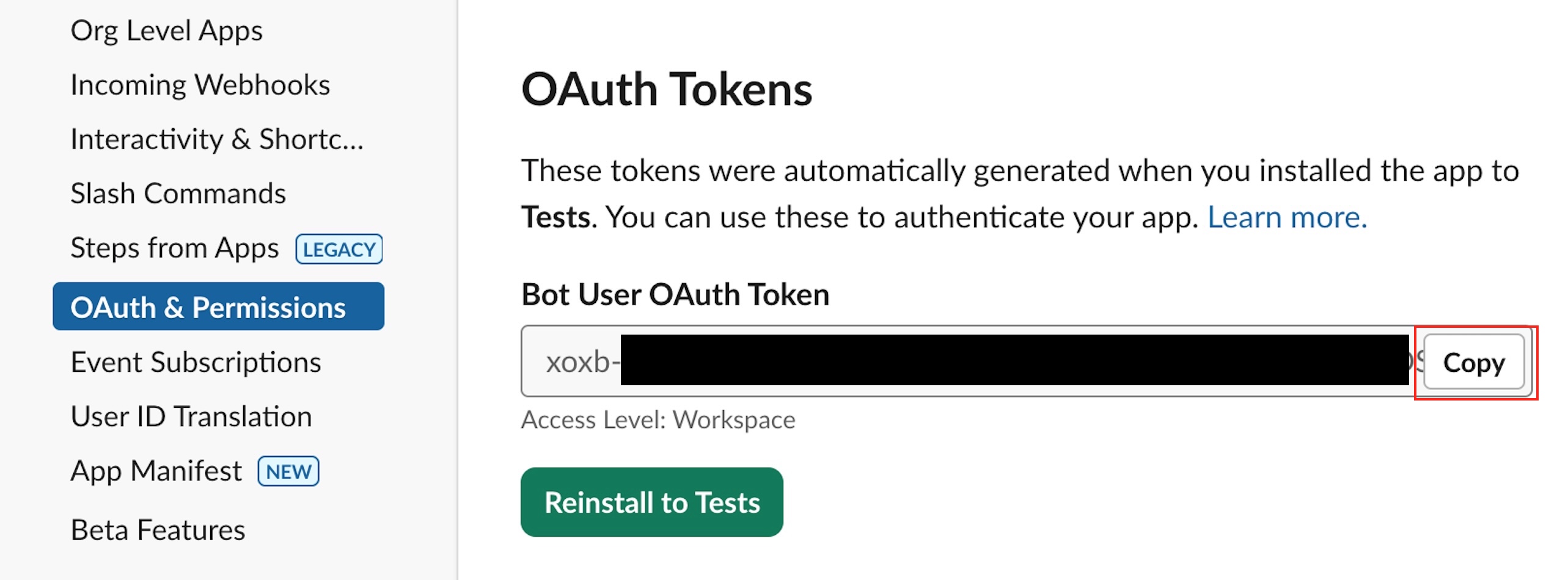 Copy Bot User OAuth Token Copy the issued Bot User OAuth Token (string starting with