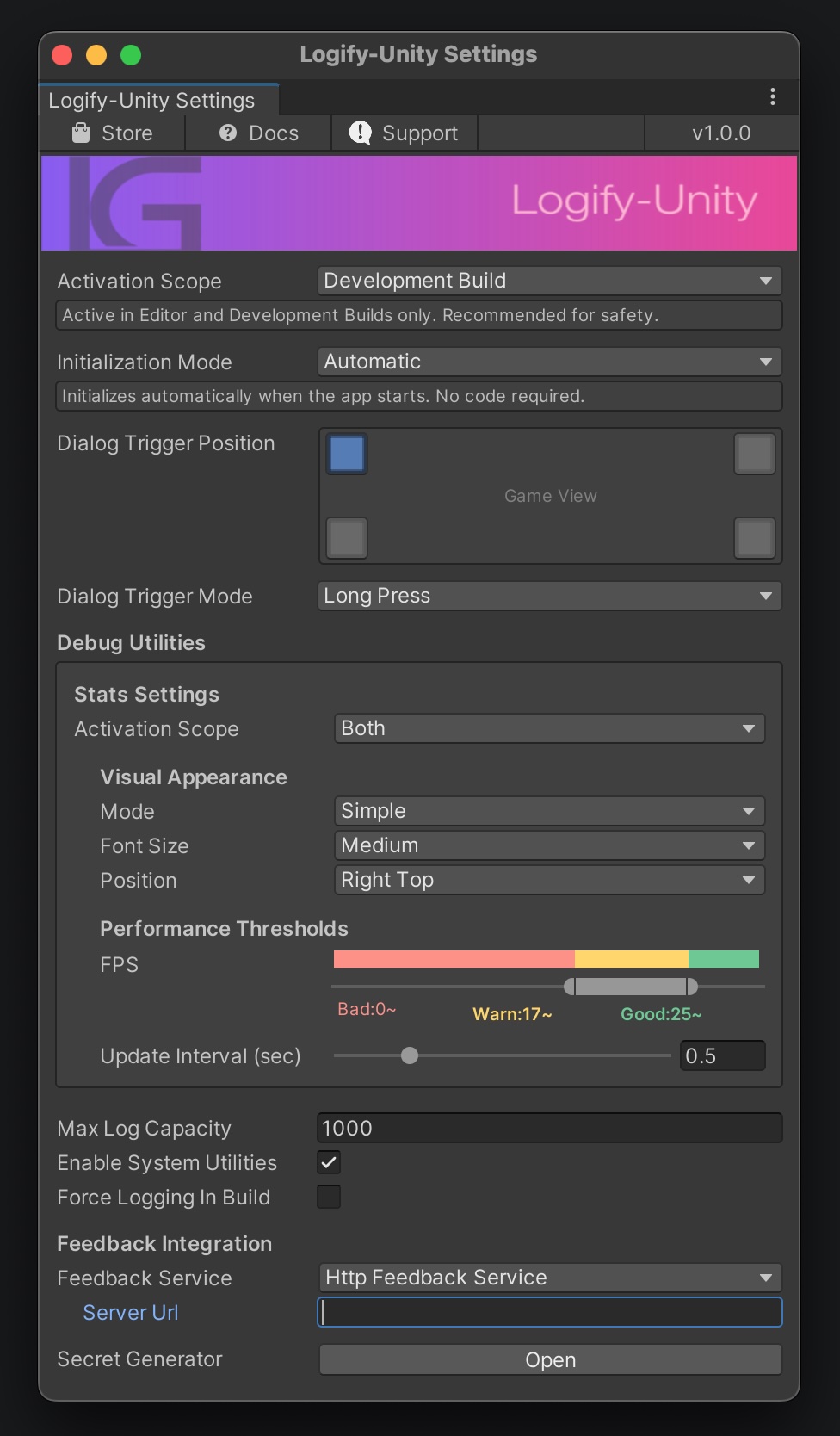 本プラグインの動作振る舞いは、Unityエディタ上の Window > Logify-Unity > Settings から一括で管理できます。