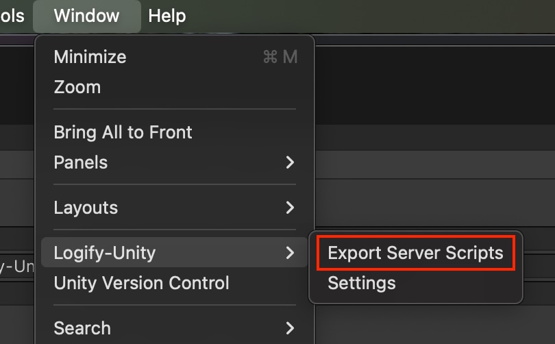 Unity エディタのメニューから Window > Logify-Unity > Export Server Script を選択し、PHP ファイル一式を任意の場所に出力します。