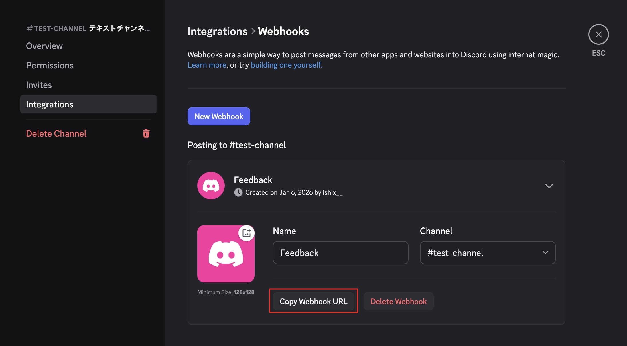 まず、フィードバックを受信したい Discord サーバーで Webhook URL を発行します。